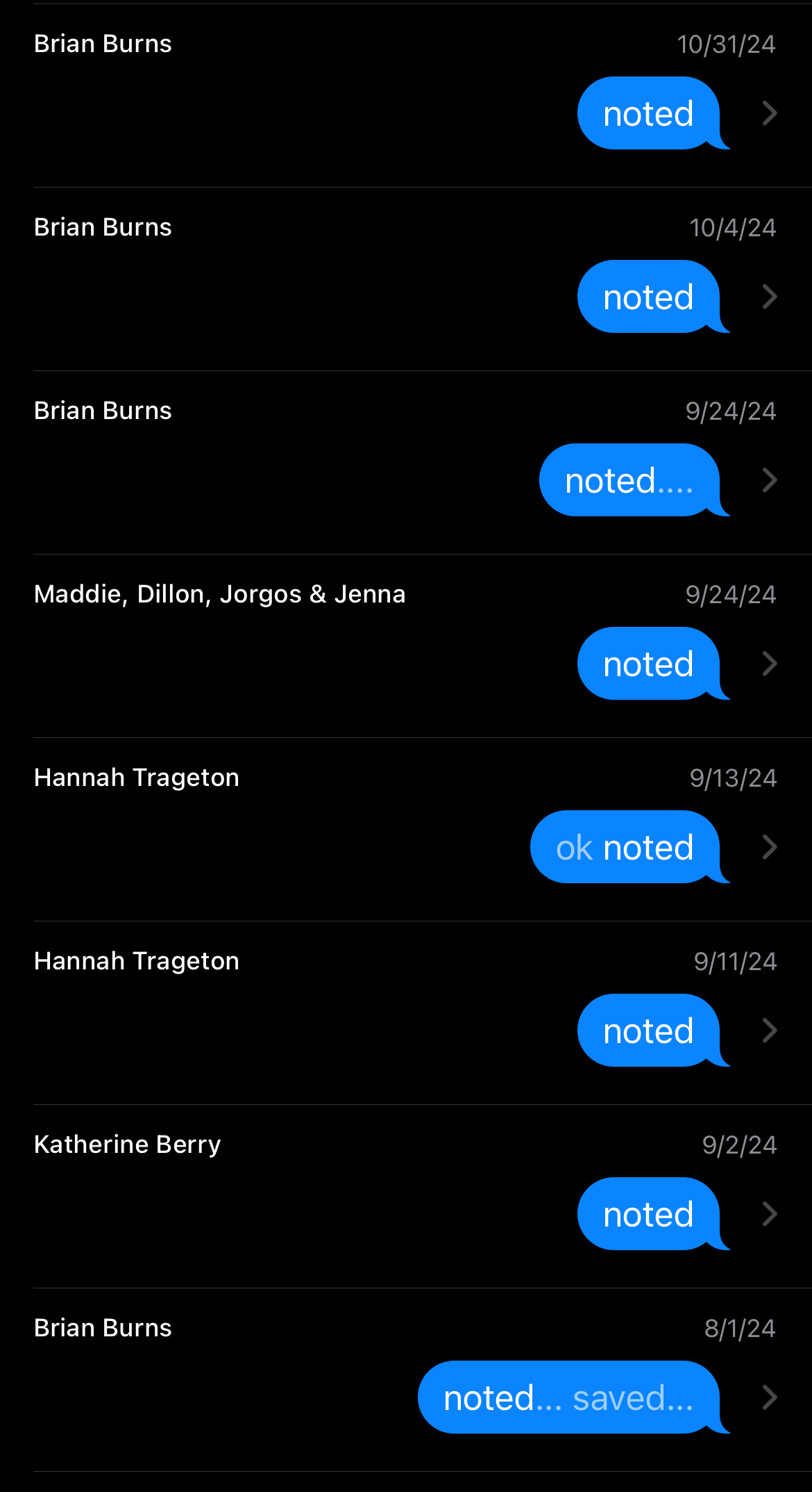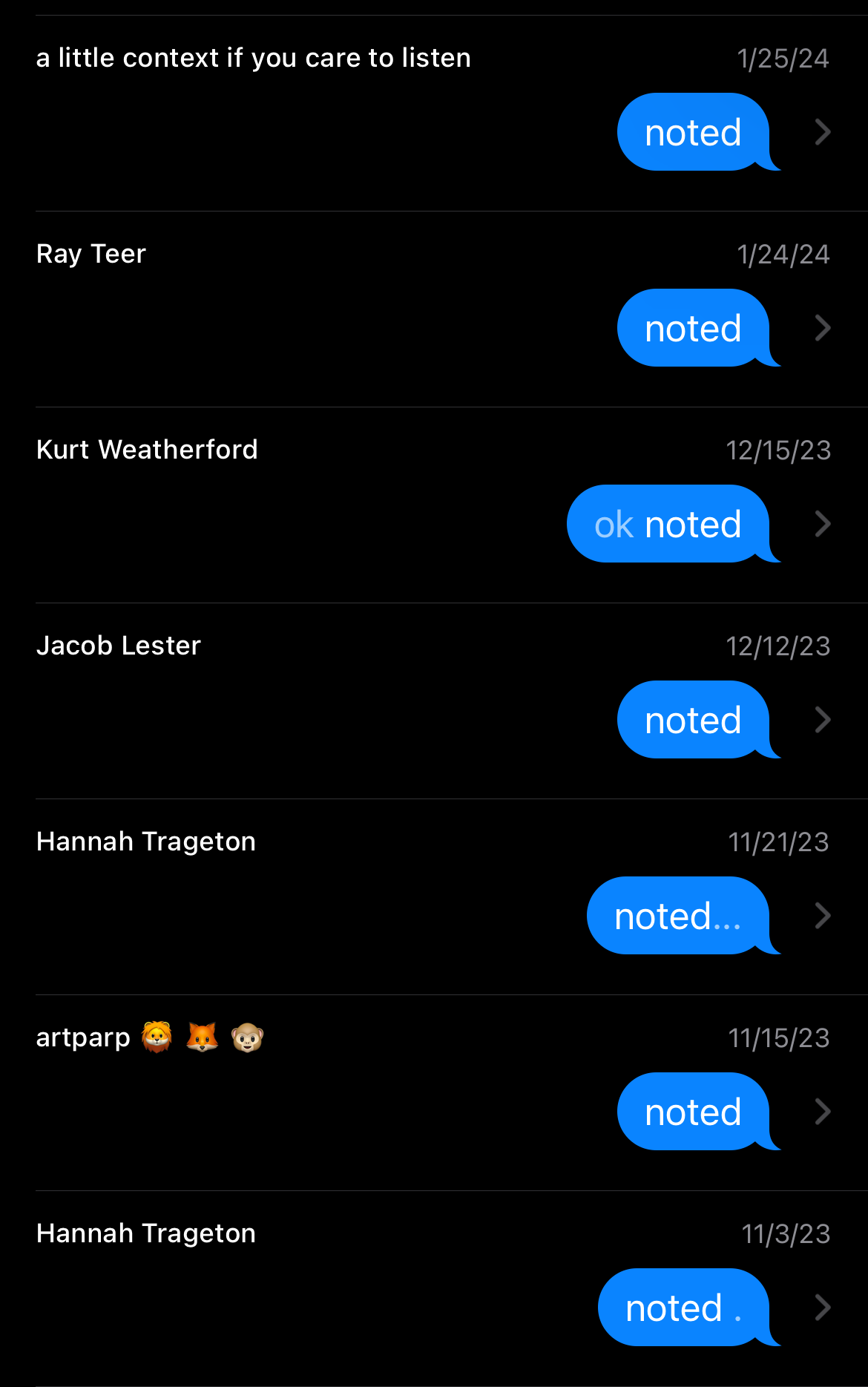 I wondered how diverse the texts were that prompted my constant response of “noted” with varying levels of punctuation. What was being noted, exactly, in these texts and the dozens of other instances of my notation? An incomplete list: